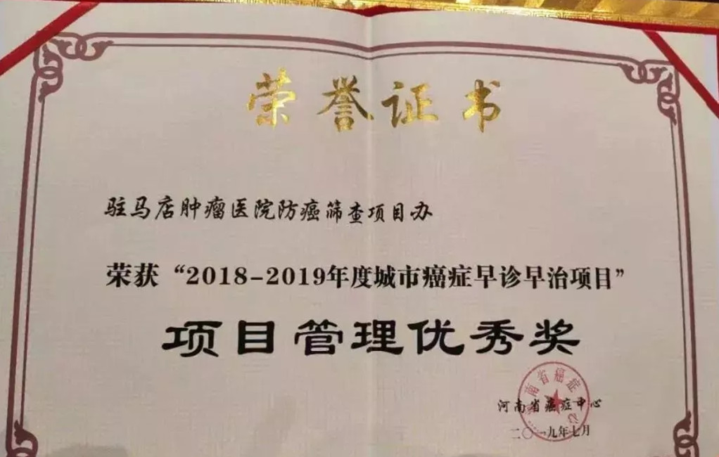 近日,在河南省癌症中(zhōng)心、河南省肿瘤医(yī)院召开的2019年度城市癌症早诊早治项目河南省启动会议上,集团成员企业河南大河医(yī)疗集团有(yǒu)限公(gōng)司旗下的驻马店(diàn)肿瘤医(yī)院荣获2018-2019年度城市癌症早诊早治项目“项目管理(lǐ)优秀奖”和“國(guó)家重大公(gōng)共卫生专项河南省城市癌症早诊早治项目指定筛查机构”。
